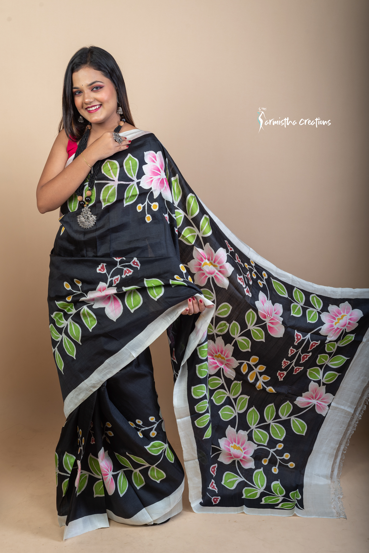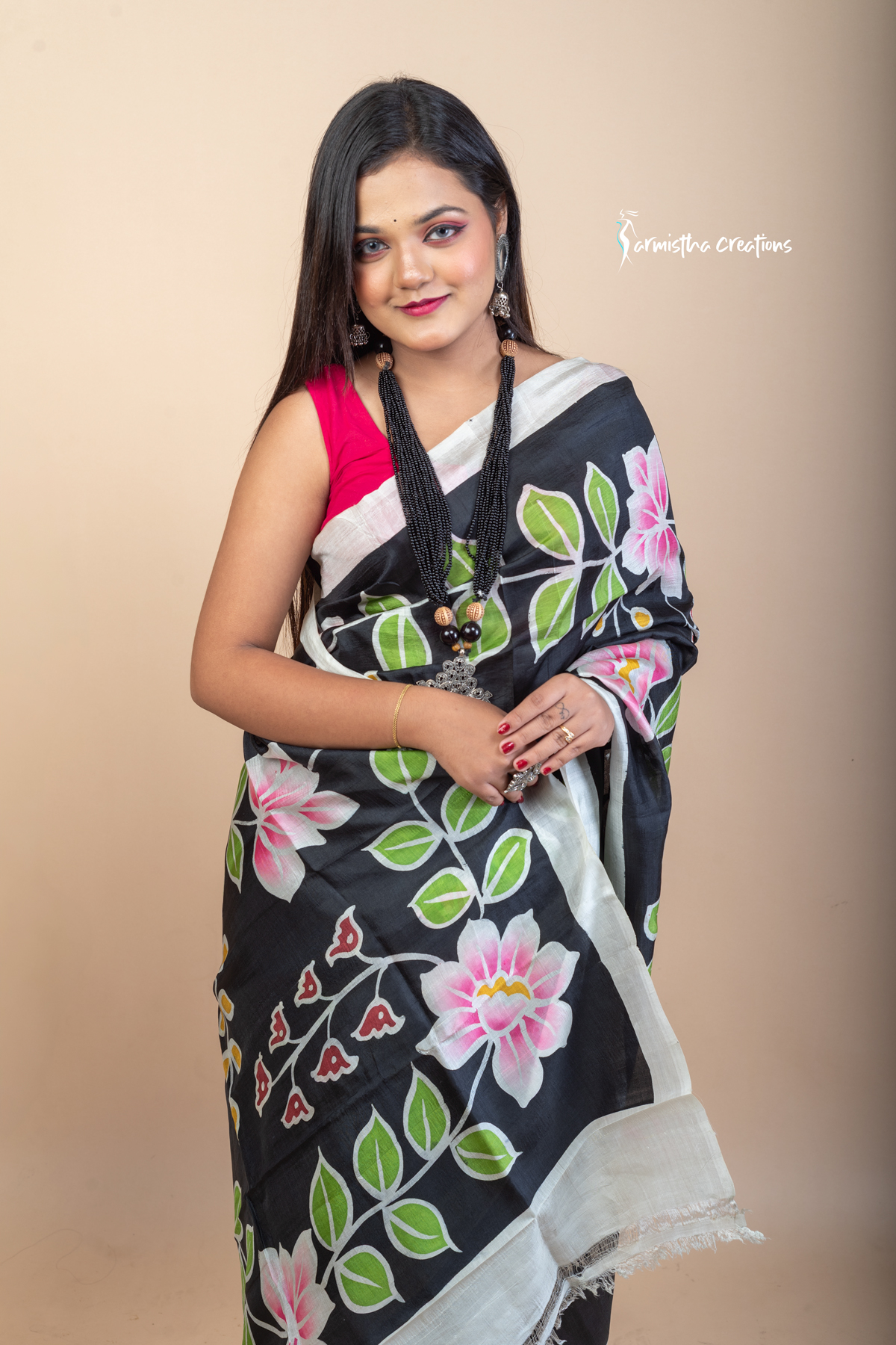 Turn every drape into a canvas with Floral Symphony, a stunning hand-painted Bishnupuri silk saree featuring vibrant lotus blooms, leafy vines, and delicate details — all brushed lovingly by skilled artisans. Set against a rich black silk base with soft white borders, the colours sing in contrast, creating an eye-catching yet graceful aesthetic.