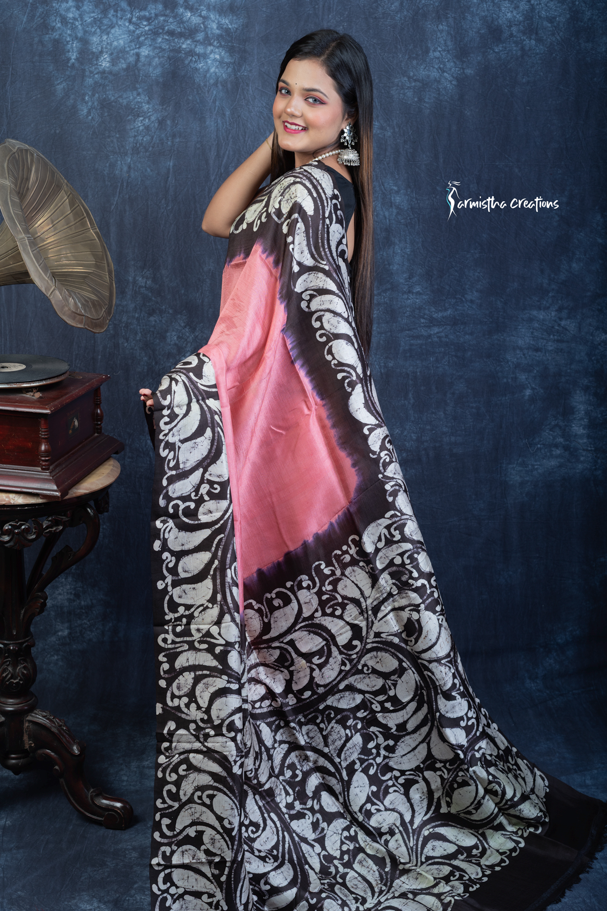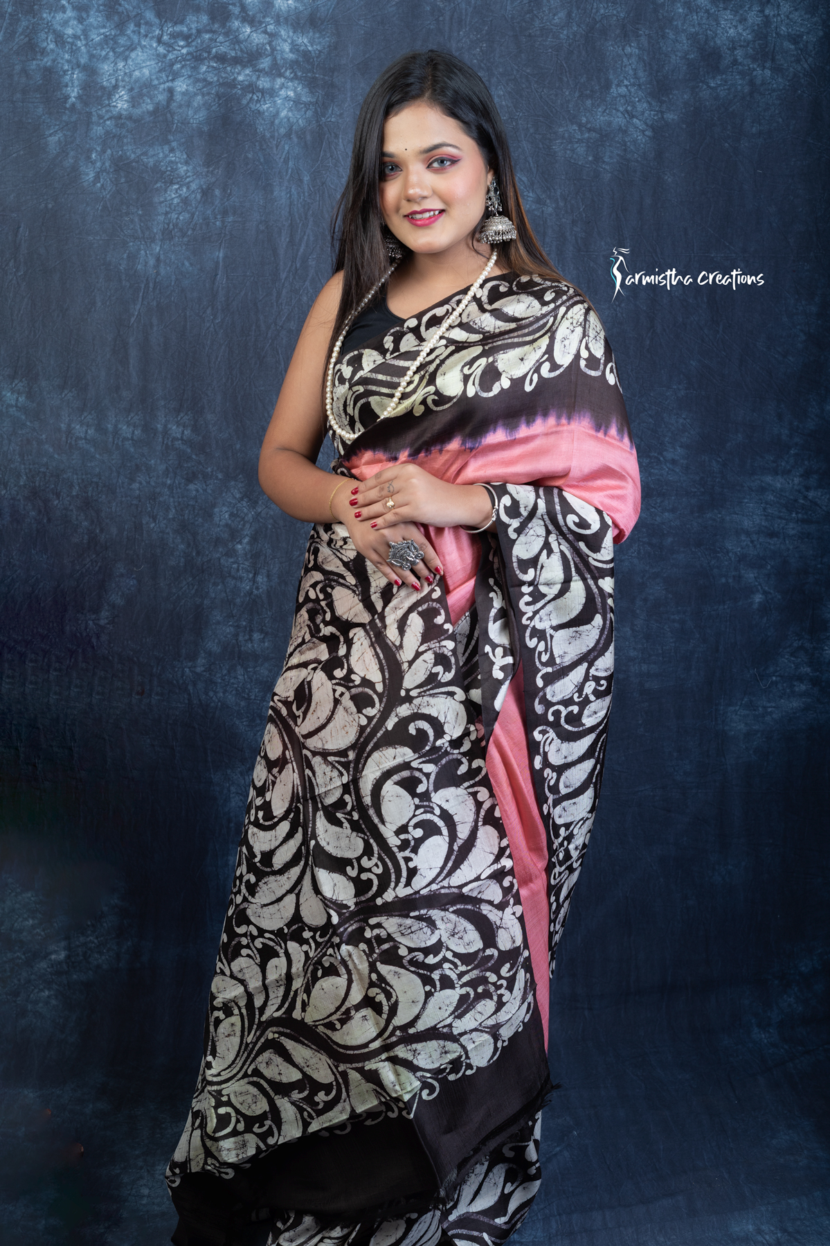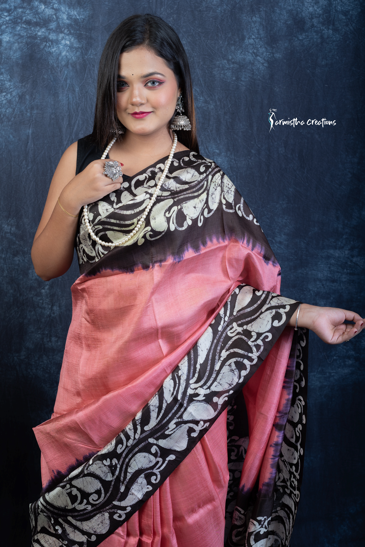 Unveil regal charm with Noor-e-Nazaakat, a Silk Mark Certified Bishnupuri silk saree adorned with authentic hand batik work. The coral-pink body blends effortlessly into bold black borders, featuring ornate ivory batik motifs inspired by Indian heritage. The fluid silk drape offers effortless sophistication, ideal for festive occasions and cultural gatherings.