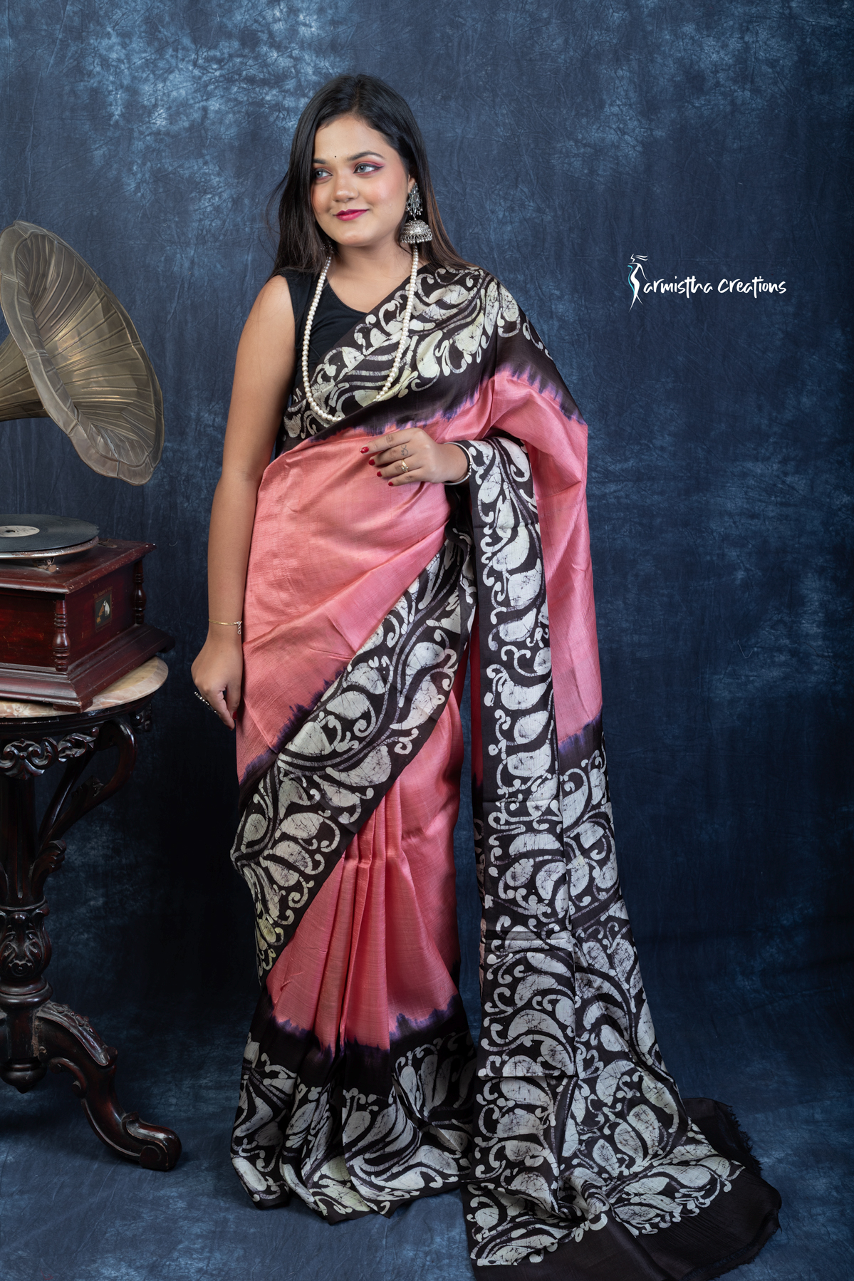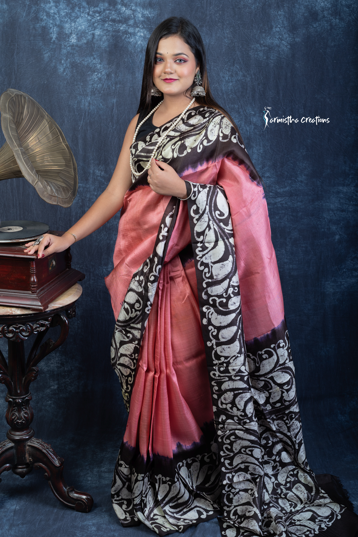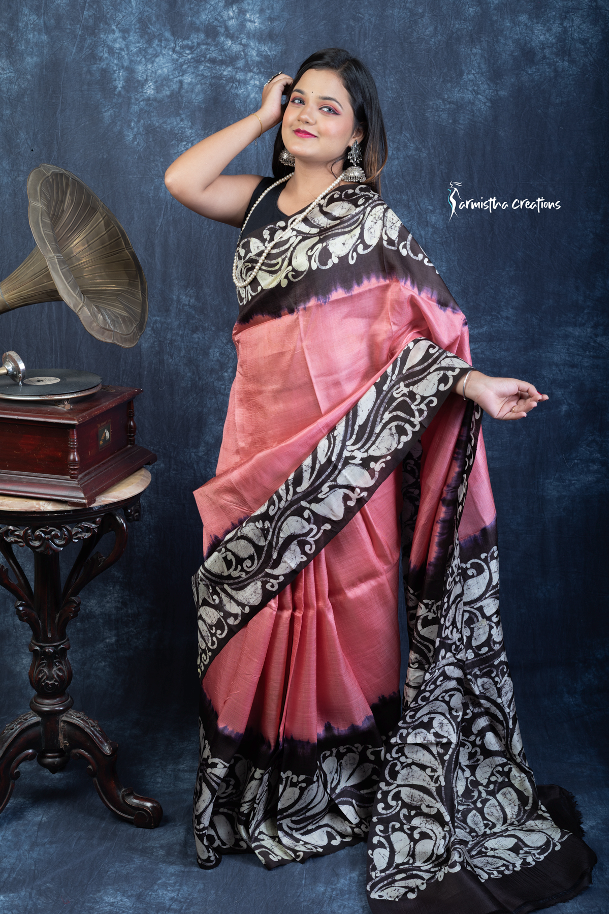 Unveil regal charm with Noor-e-Nazaakat, a Silk Mark Certified Bishnupuri silk saree adorned with authentic hand batik work. The coral-pink body blends effortlessly into bold black borders, featuring ornate ivory batik motifs inspired by Indian heritage. The fluid silk drape offers effortless sophistication, ideal for festive occasions and cultural gatherings.