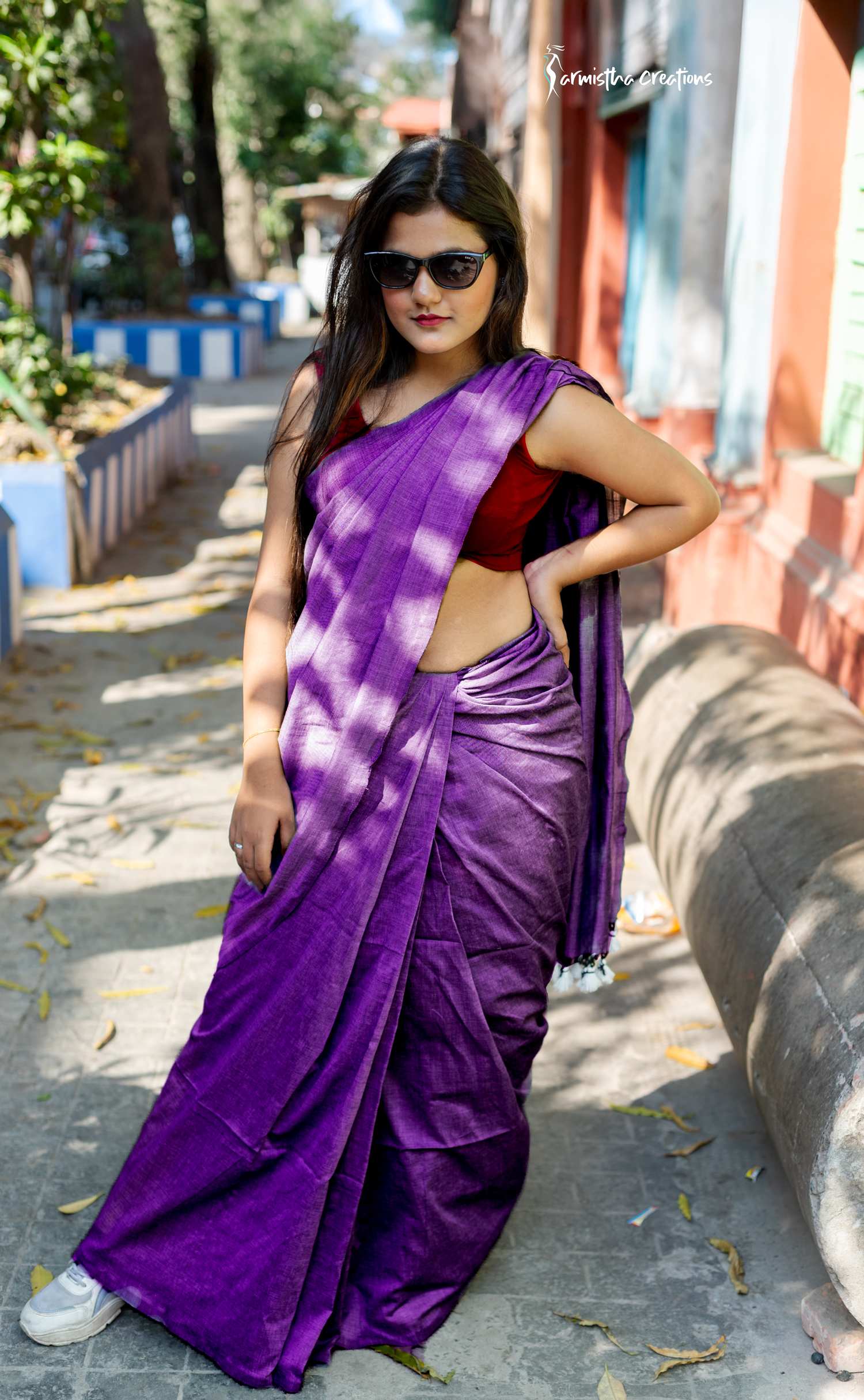 This is a pure cotton saree in solid jamun colour. Pair it with a contrast dark blouse for that casual and yet elegant look.