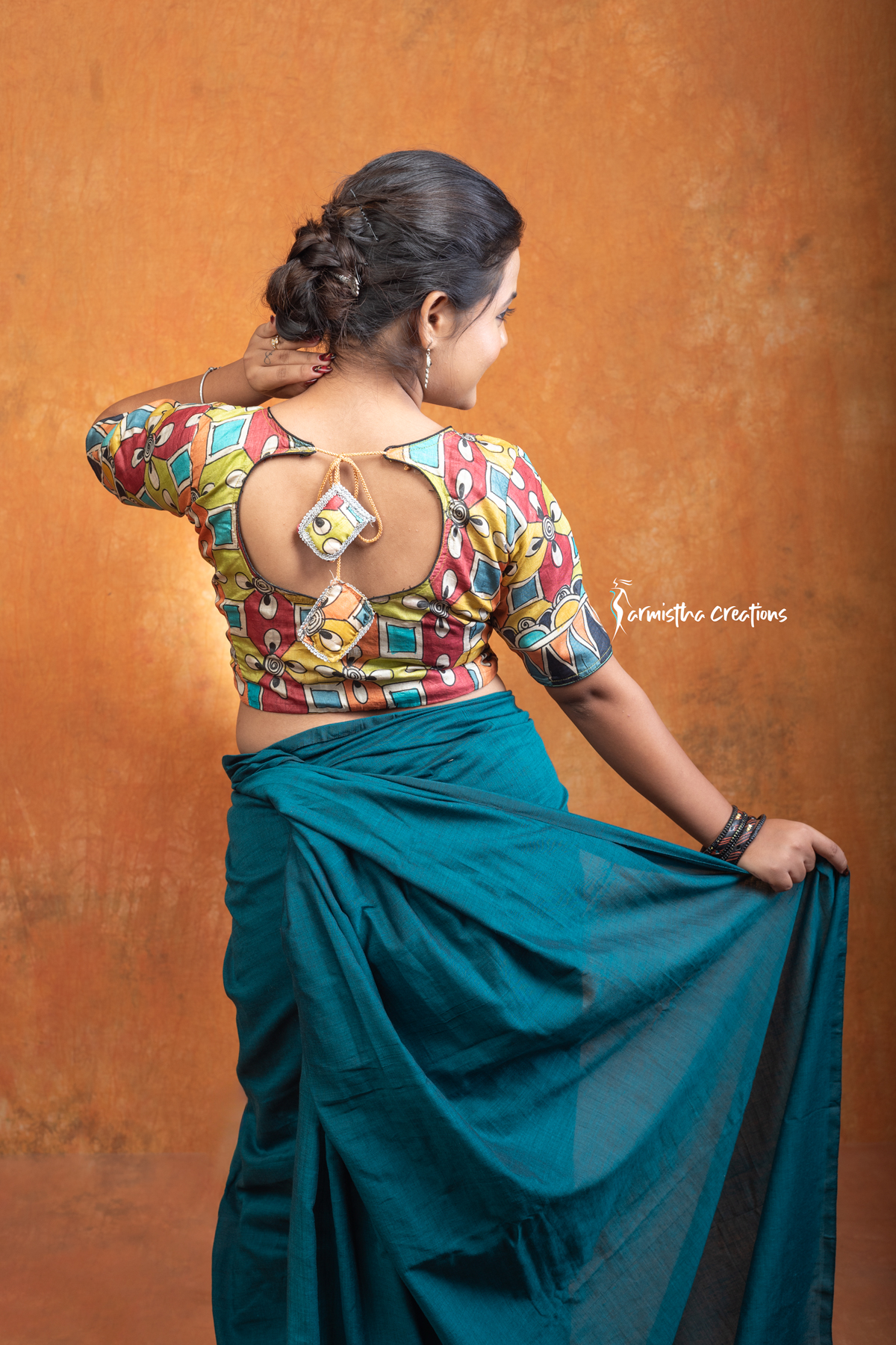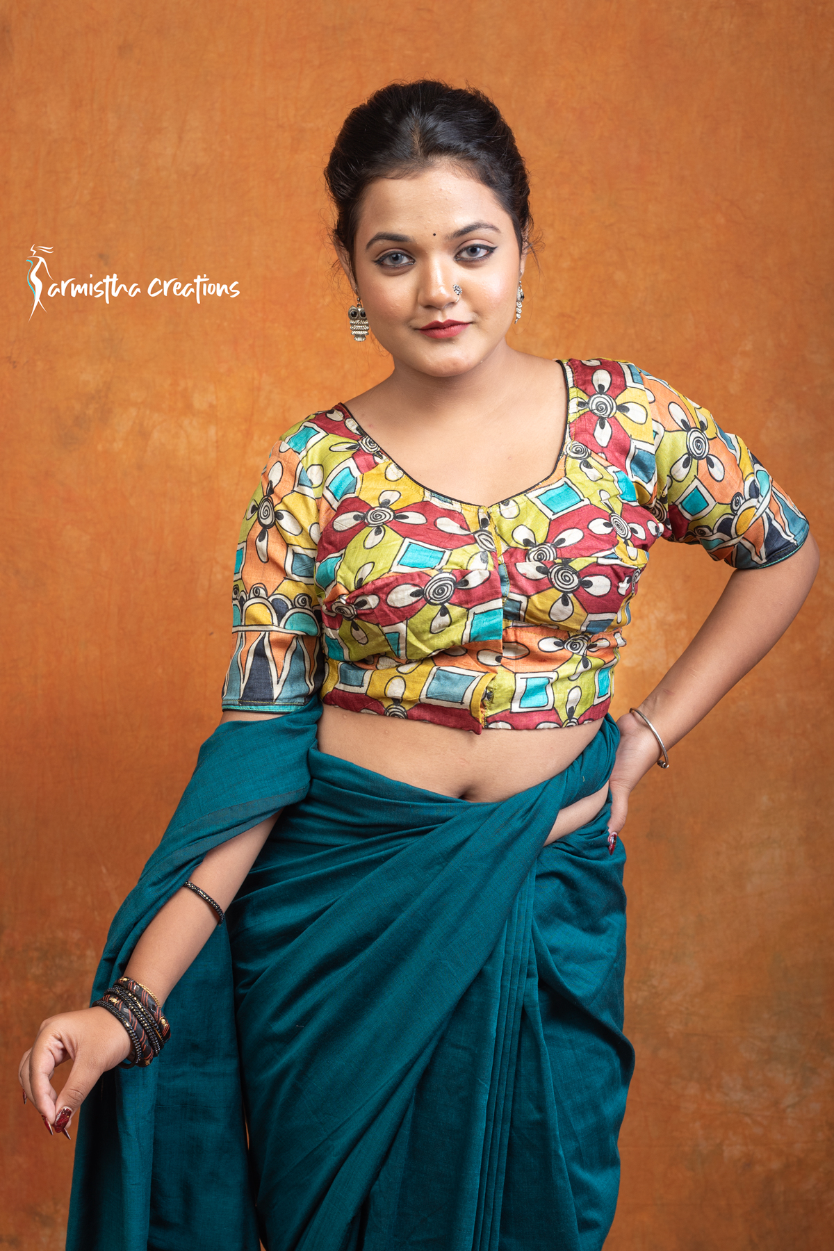 Rangashree is a hand kalamkari ready-stitched blouse that celebrates the festive spirit of colors. Adorned with bold floral and geometric kalamkari motifs in hues of red, mustard, teal, and orange, this blouse radiates vibrancy and charm. With its flattering neckline and half-sleeve design, Rangashree pairs effortlessly with both traditional silks and contemporary drapes, making it a versatile statement piece for celebrations.