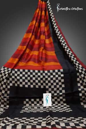 Checkmate in Vermilion – Hand-block Printed Murshidabad Silk Saree | hbpms-025