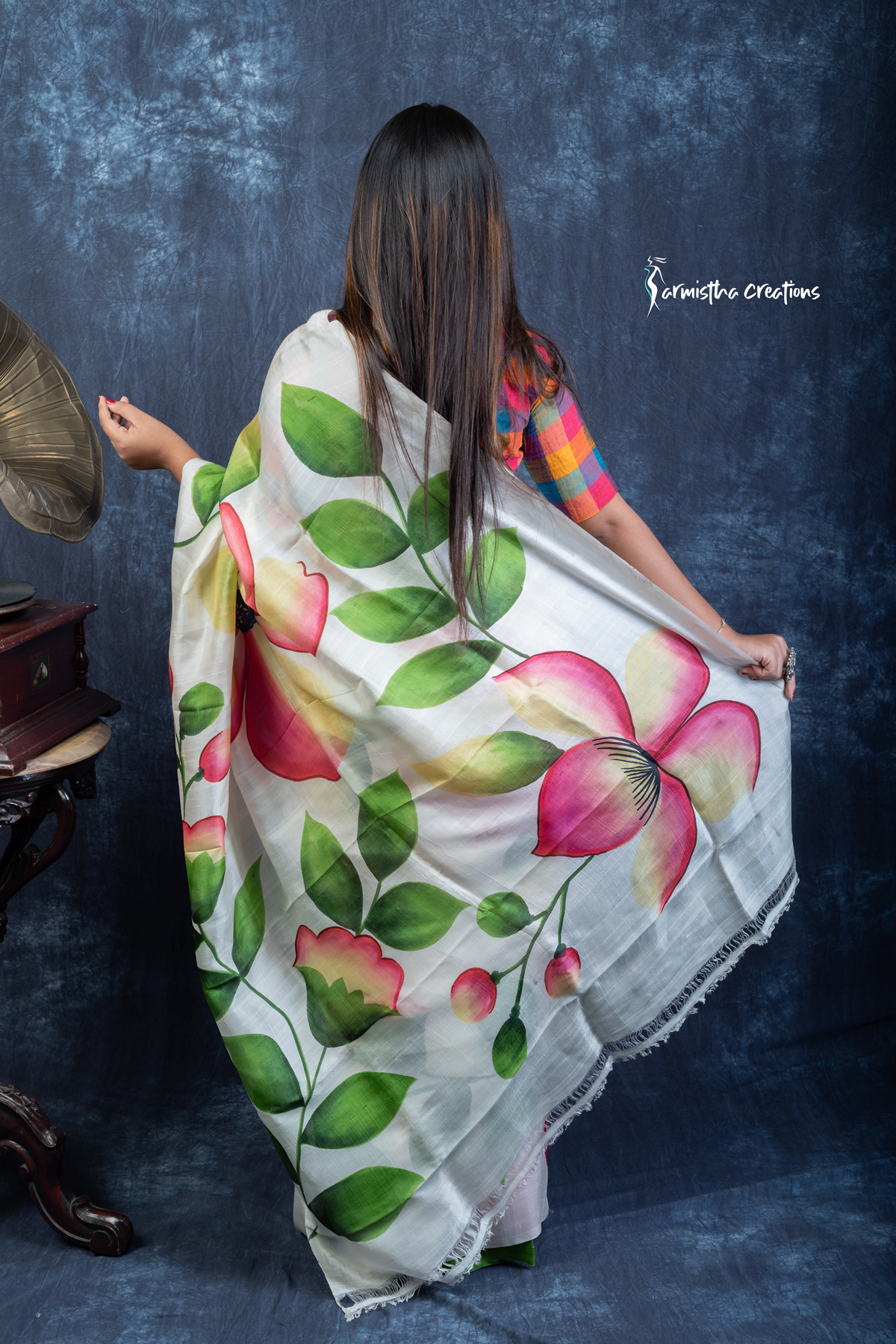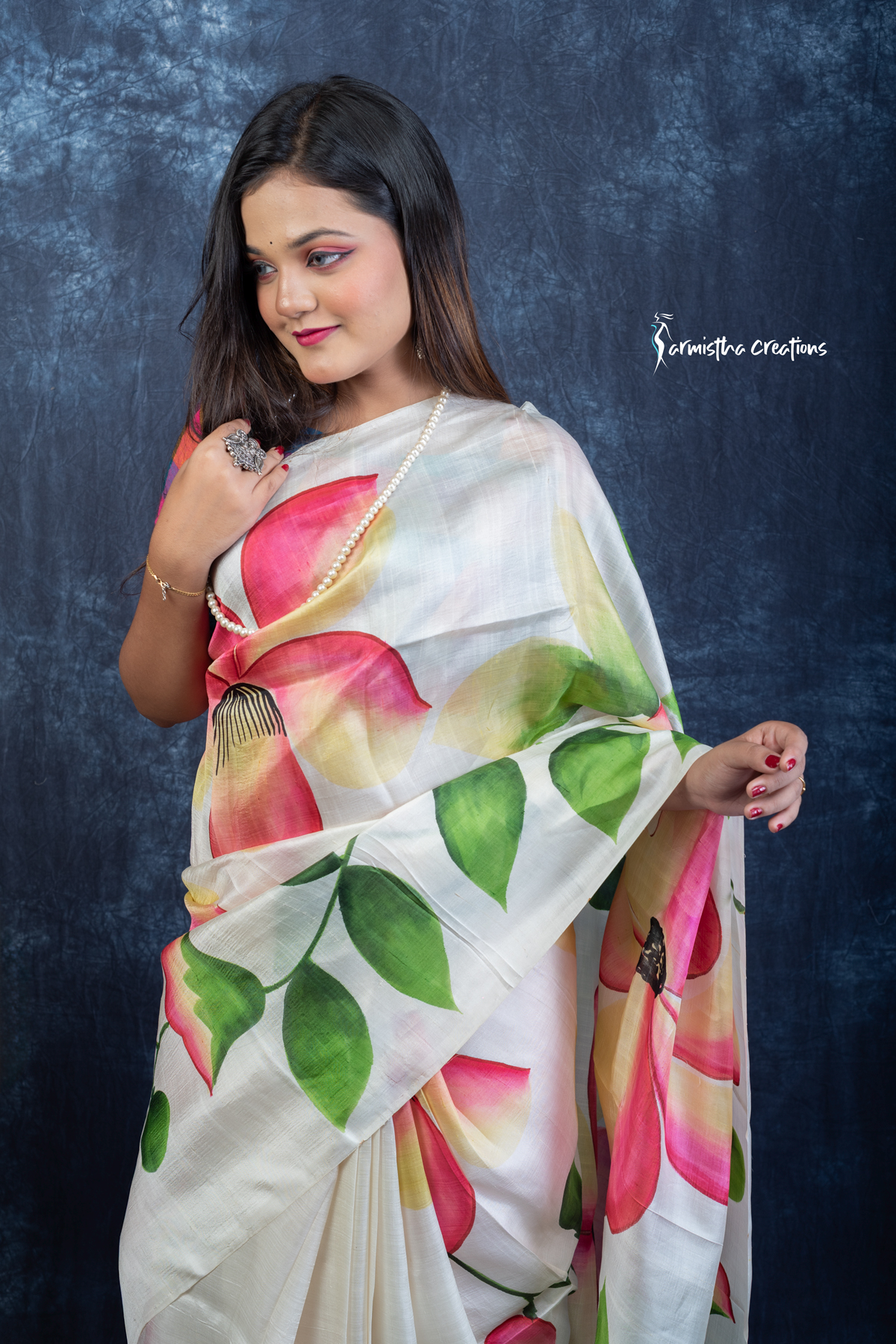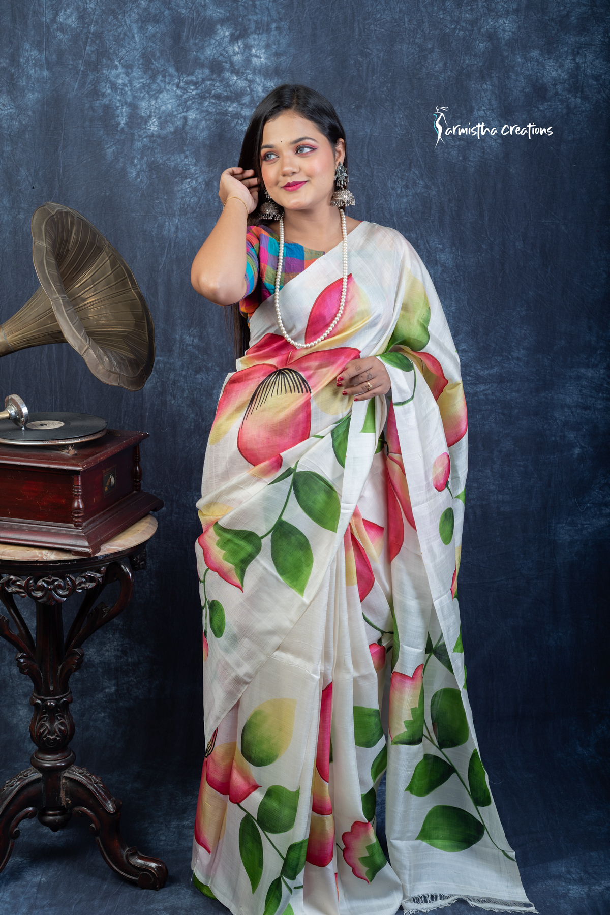 Infused with the freshness of spring, Spring Sonata is a stunning hand-painted Murshidabad silk saree that evokes effortless grace and timeless artistry. Crafted on soft ivory silk, its palette of vibrant pink florals and leafy green vines creates a visual melody of colour and nature. The fluid texture and natural sheen of pure Murshidabad silk give this saree a luxurious yet featherlight drape.
