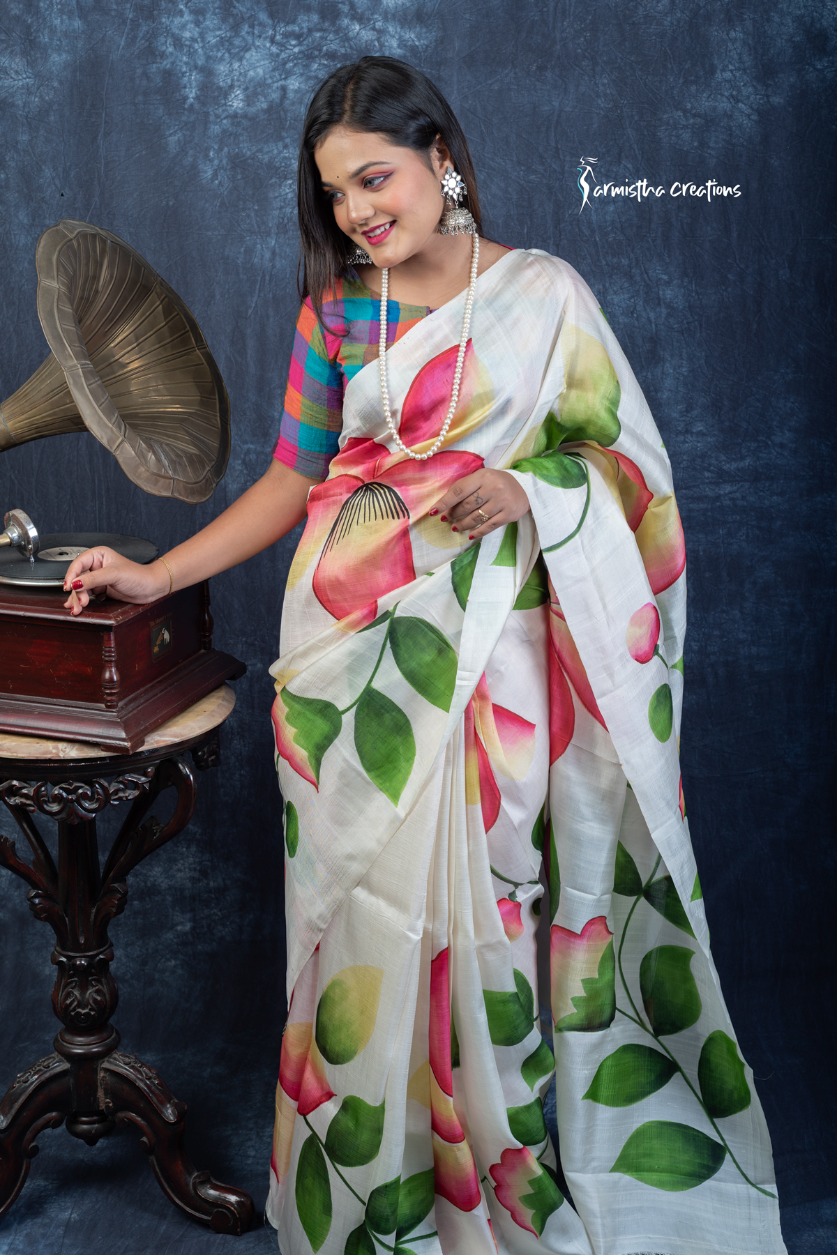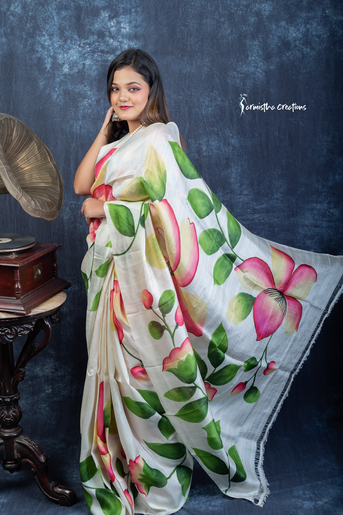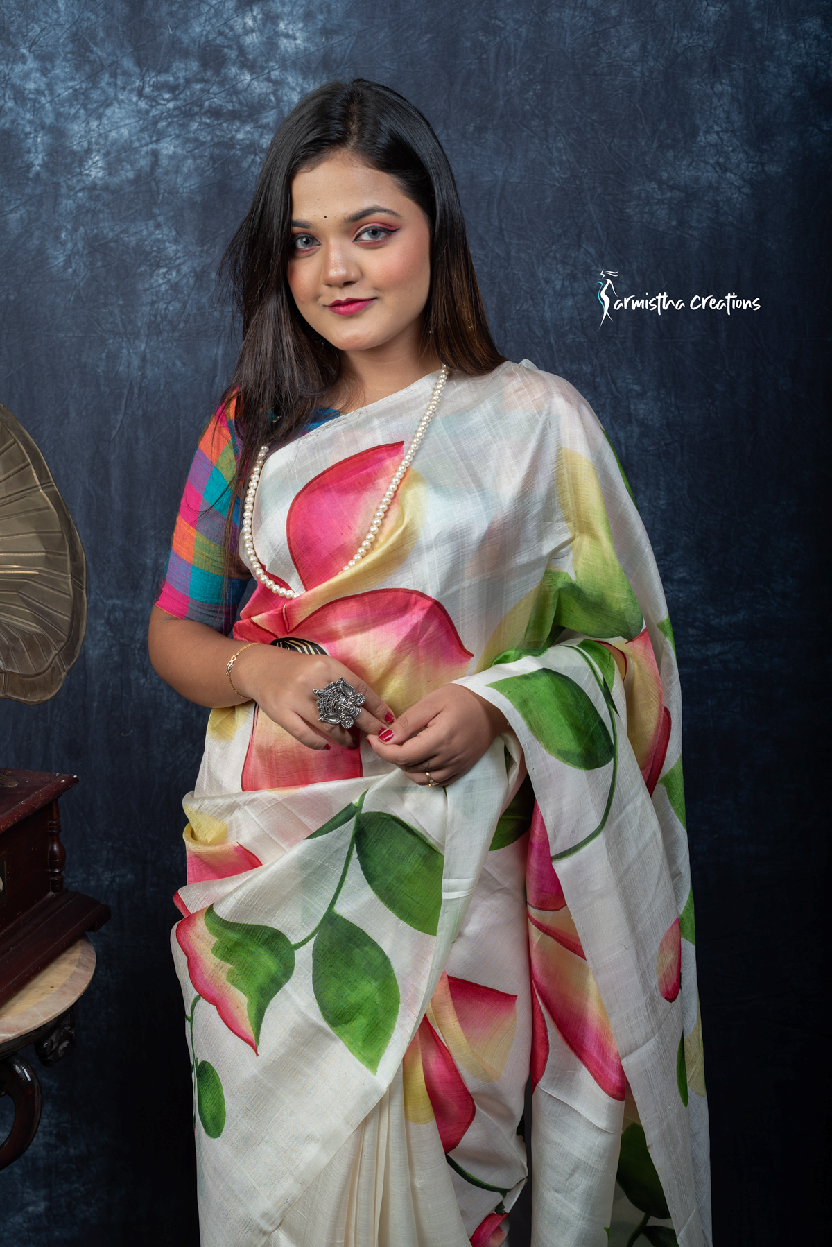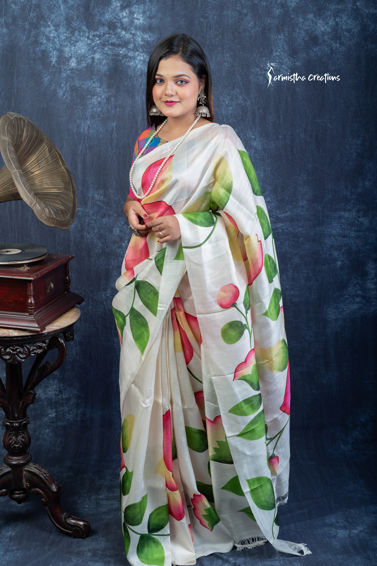 Infused with the freshness of spring, Spring Sonata is a stunning hand-painted Murshidabad silk saree that evokes effortless grace and timeless artistry. Crafted on soft ivory silk, its palette of vibrant pink florals and leafy green vines creates a visual melody of colour and nature. The fluid texture and natural sheen of pure Murshidabad silk give this saree a luxurious yet featherlight drape.