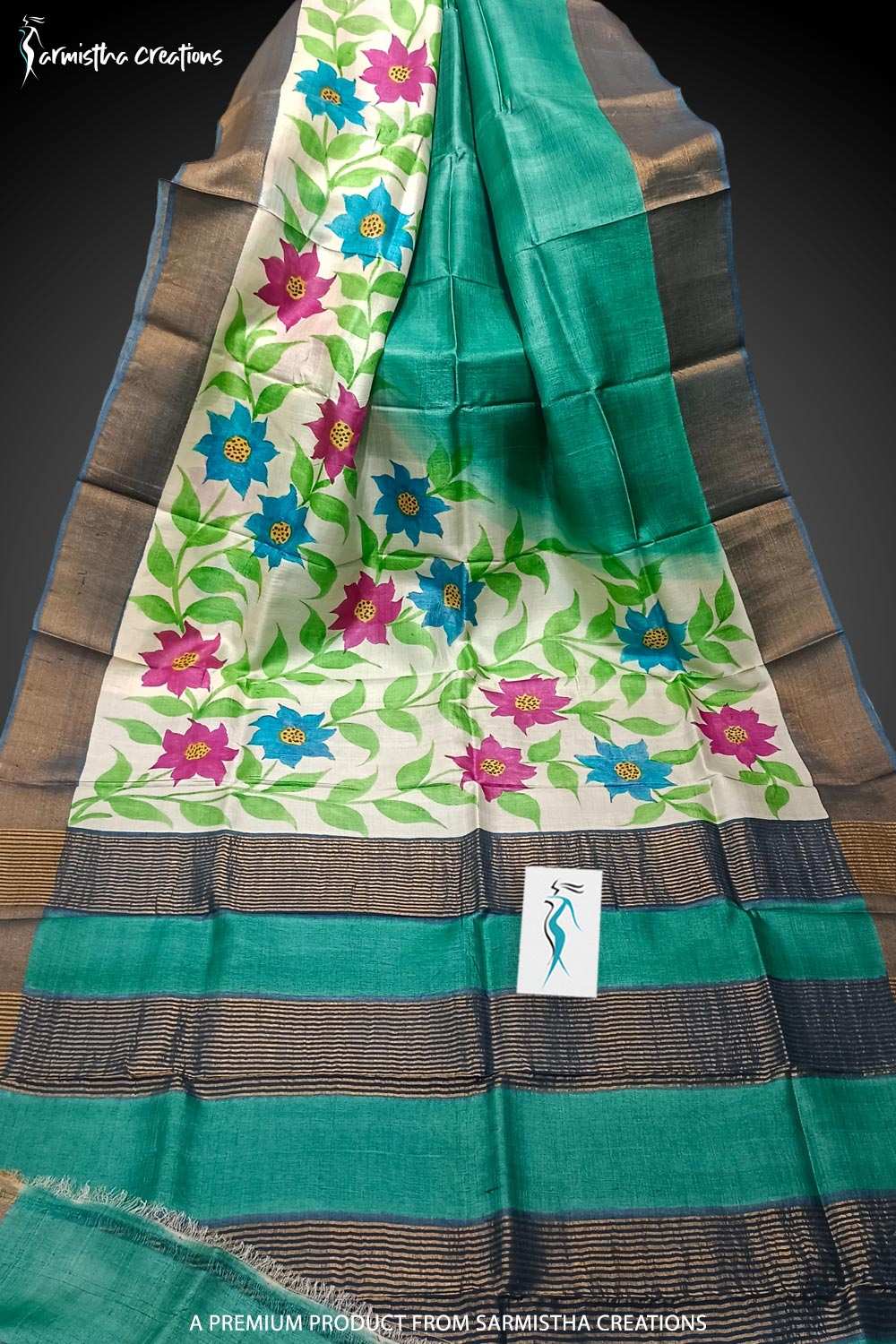 This is a zari border pure desi tussar silk saree and comes with traditional hand-block printed motiffs.